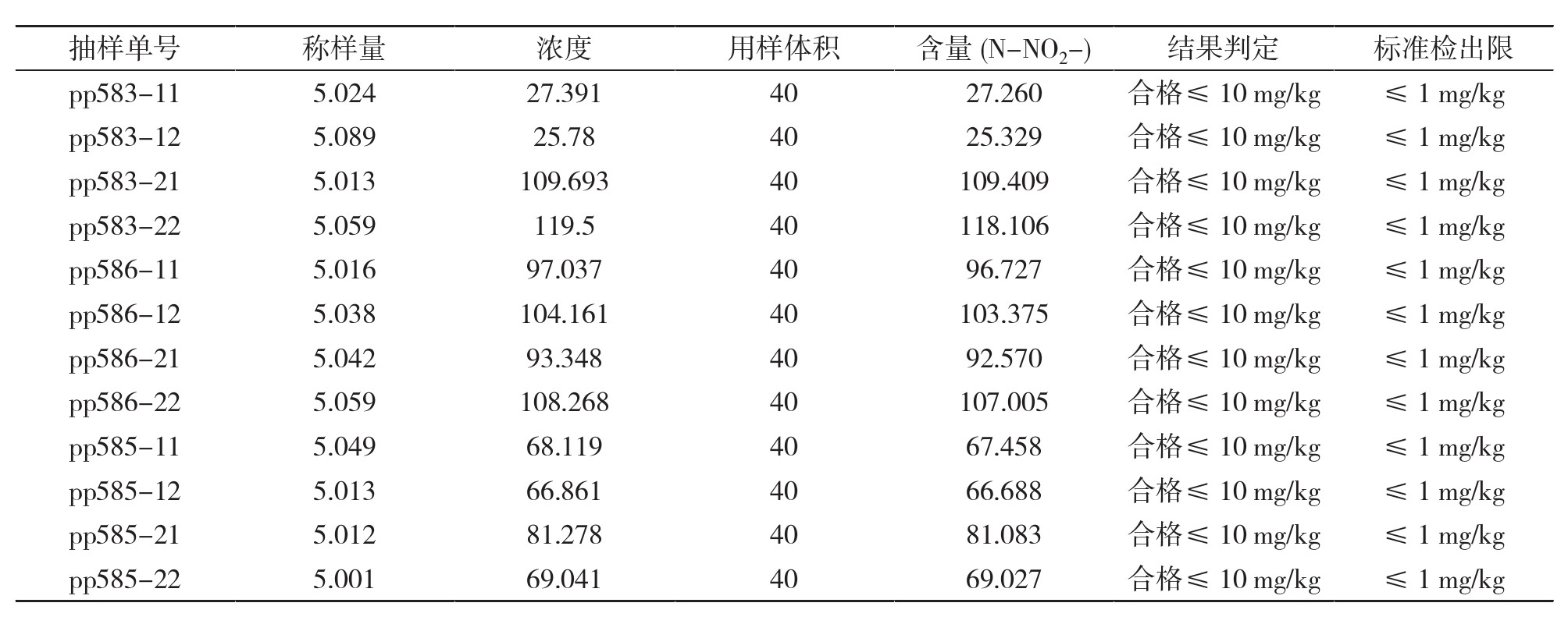 根据2次测定结果,样品中亚硝酸盐的含量分别为80.34 mg/kg和93.31 mg/kg,取平均值为85.33 mg/kg。根据国家标准GB 2762—2017《食品中限制使用的添加剂》规定,食品中亚硝酸盐的限量标准为150 mg/kg。因此,样品中亚硝酸盐含量低于限量标准,可以判断该样品的亚硝酸盐含量合格。