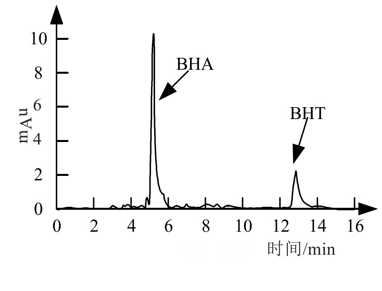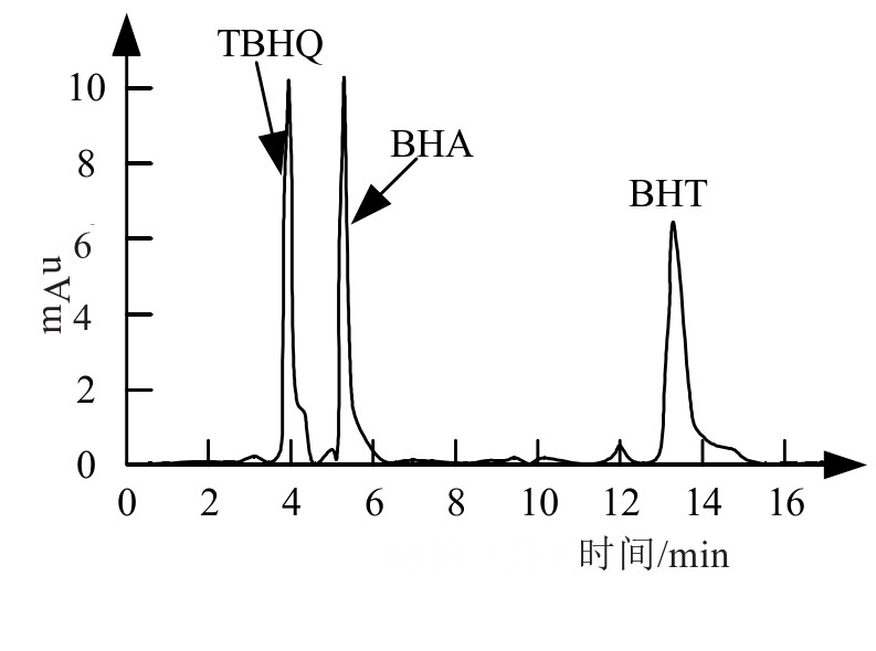 由于不同的抗氧化食品添加剂,出峰的时间并不相同,可以通过检测样品组分的形式得到其准确分离的时间[18]。3种抗氧化剂的混合溶液色谱图如图1所示,记录了3种组分的出峰情况。从中可以看到,经过4 min,TBHQ分离,出现吸收峰,而5 min左右BHA分离,对应吸收峰出现,最后出现的为BHT对应的吸收峰,时间约为12 min。由此可知静置14 min左右3种添加剂将完全分离。