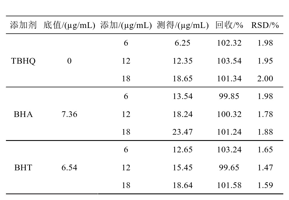 选择3号样品,相同条件下,进行不同时间上的多次实验,计算其稳定性。经过多次测试之后,TBHQ的含量均在11.45~12.53 mg/mL之间,RSD也稳定在1.68%~2.05%之间,另外2种抗氧化剂的含量也同样变化不明显,证明该方法的稳定性,可适用于样品检测。