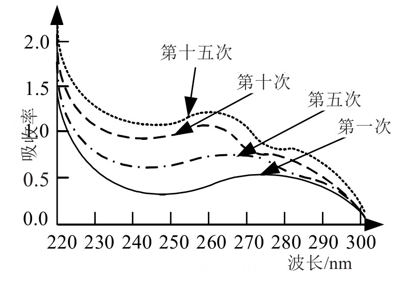 紫外-可见吸收光谱是指工作在紫外波段的一系列光谱,其波长范围一般选择200~800 nm,选择该波长范围内的光吸收程度或者发光效果,来分析物质组分的方法称为紫外-可见吸收光谱技术[10]。由于不同的组分分子对应的能级并不相同,当其出现价电子或者电子跃迁时,就会伴随相应的能量变化,从而可以根据光子的变化检测出物质的成分情况。