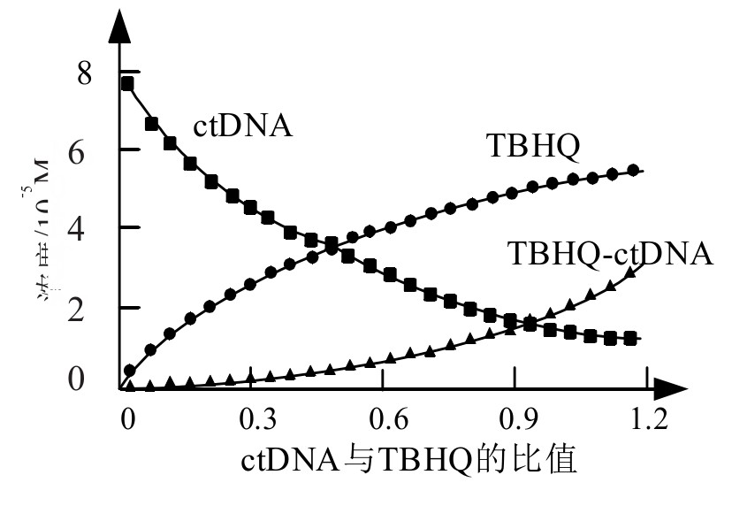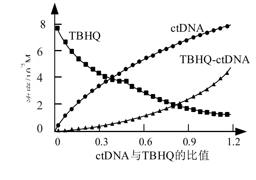 实验2:不改变小牛胸腺DNA的浓度(0.015 mg/mL),每次增量为0.0088 mg/mL的TBHQ溶液滴加到ctDNA溶液中。