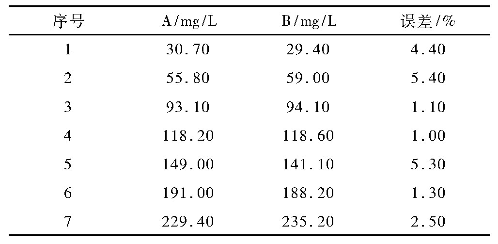 根据图5标准曲线纵向方程COD=186.5×A254-27.53得出邻苯溶液标准COD数值记为A,将国标GB11914—89化学需氧量检测邻苯溶液数值记为B,对比分析两组数值,具体如表3所示。从表中可知A组与B组两者差值较小,但让存在一定的误差。为进一步验证两者是否具有相关性,采用统计学t检验,得出A组与B组两者数值差异不明显,可进一步验证了紫外可见光谱大对水质化学需氧量检测的可行性。