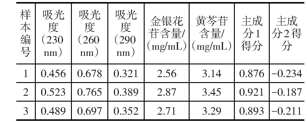 本文选取了双黄连口服液中的2种主要成分(金银花苷和黄芩苷)进行定量分析。通过紫外光谱法检测了不同样本在230 nm、260 nm和290 nm波长下的吸光度,并测定了对应的金银花苷和黄芩苷含量。双黄连口服液主成分吸光度、含量及主成分得分数据见表3。