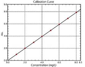 高锰酸钾溶液浓度和吸光度的线性曲线。直到8Abs都有好的线性。