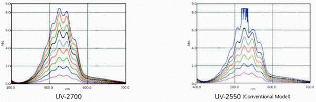 UV-2700实现了超低杂散光,扩展测定范围至8Abs,透过率0.000001%。除了测定高浓度样品不需要稀释外,此系统还能用于评价偏振膜的透过率性能。