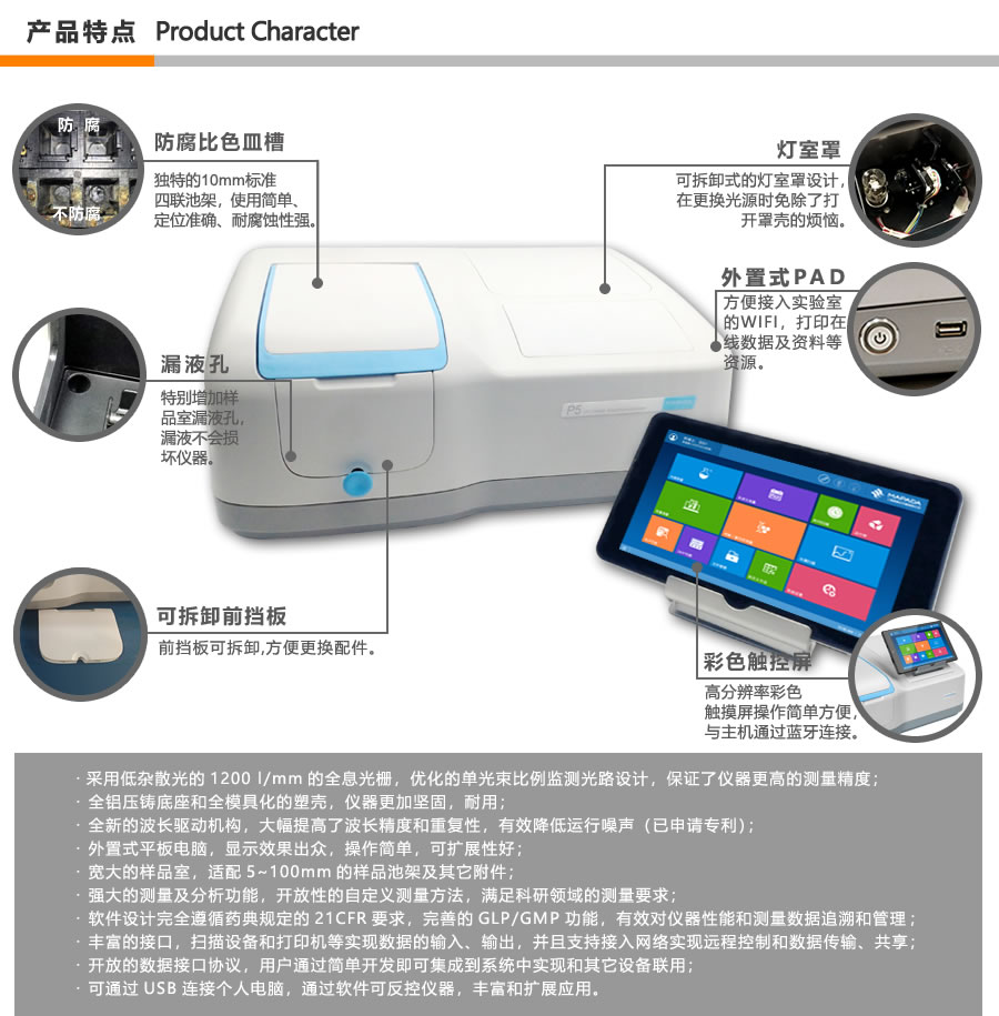 P6双光束监测紫外可见分光光度计通过简单的参数设定,方便地进行光度分析、定量分析、动力学测试,配合专业的Mapada的扫描分析软件,可实现全波长光谱扫描、多波长测试