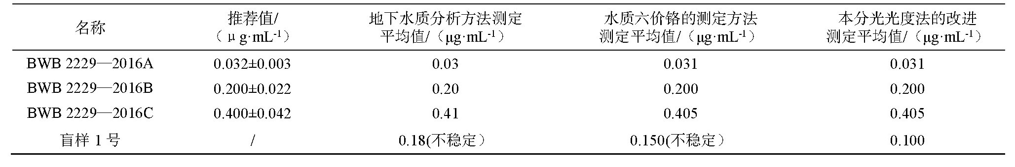 采用地下水质分析方法,水质六价铬的测定方法,本分光光度法的改进进行对比,对水质成分分析标准溶液物质BWB 2229—2016A、BWB 2229—2016B、BWB 2229—2016C、盲样1号平行实验测定6次。实验结果见表2。测定结果表明,该方法的改进结果优于其他法,且结果满足分析要求。