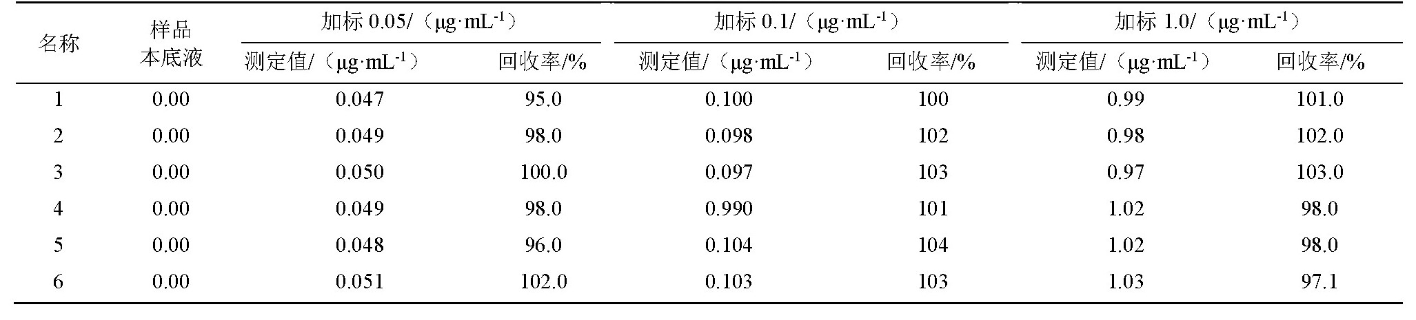 对样品进行样品处理后,样品加标测定,分别分析6次,分别添加标量为0.05,0.10和1.00μg·mL-1,结果见表4。由此表可见回收率达到95%~104%,该结果符合要求。