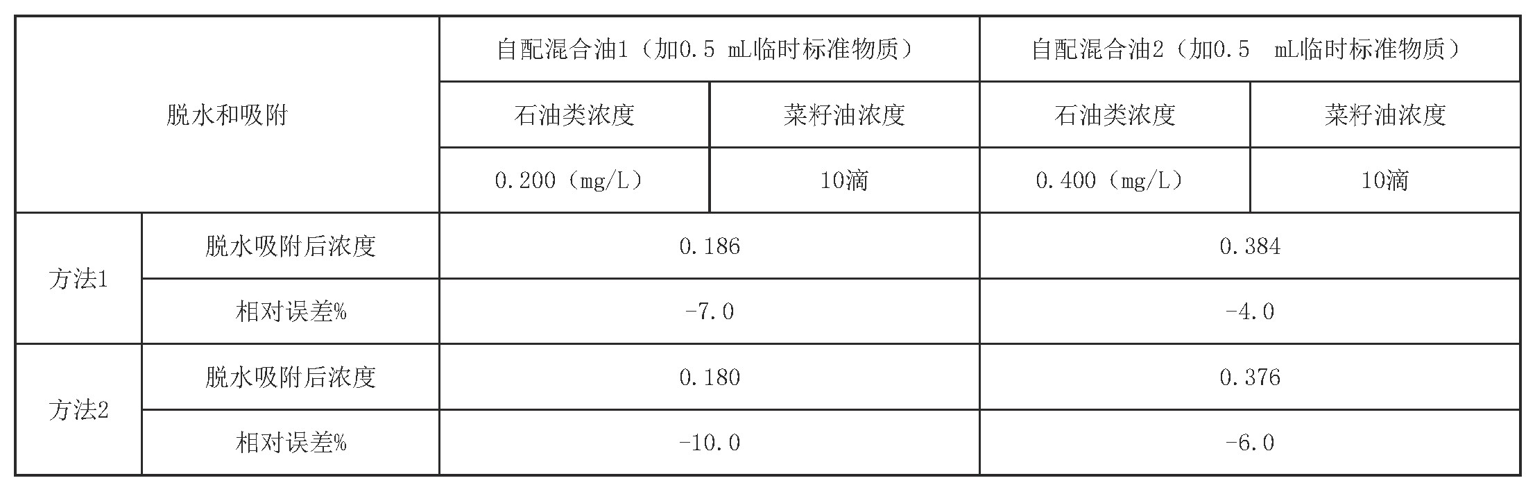 由表3可见,方法一的相对误差为-7.0%~-4.0%,方法二的相对误差为-10.0%~-6.0%,差别不显著。方法一在锥形瓶封闭体系中完成,脱水和吸附可同时操作,减少了溶剂挥发和低沸点组分的油类损失,也减轻了对分析人员的健康危害。方法一的药品用量比方法二少2~3倍,在两种方式对测量结果无显著差别的情况下,方法一可操作性更强,可批量操作,吸附效果好,优选方法一。