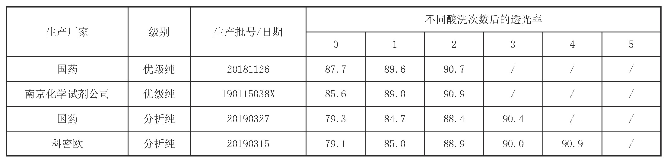 下面对3个厂家4种批号透光率低于90%的正己烷进行脱芳处理,不同酸洗次数后的透光率结果见表1。
