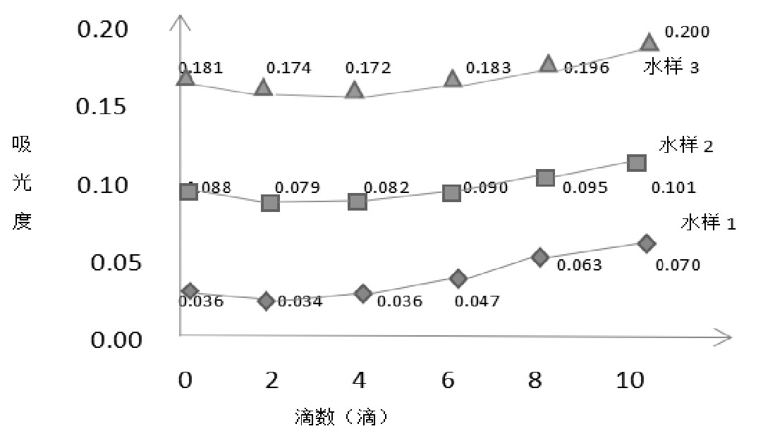 结果显示,不加乙醇破乳,对污染的水样影响稍大一些。清洁水样加入2滴乙醇破乳效果很理想,污水加入3~4滴也能达到理想的破乳效果。从图中可看出,乙醇不超过4滴,对样品测定的吸光度可以忽略,加入到第四滴时,吸光度开始有增高趋势。随着用量增大,样品的吸光度也逐渐增大,产生正干扰。因此用乙醇破乳时,用量要控制在0.2 m L(4滴以内)为好。
