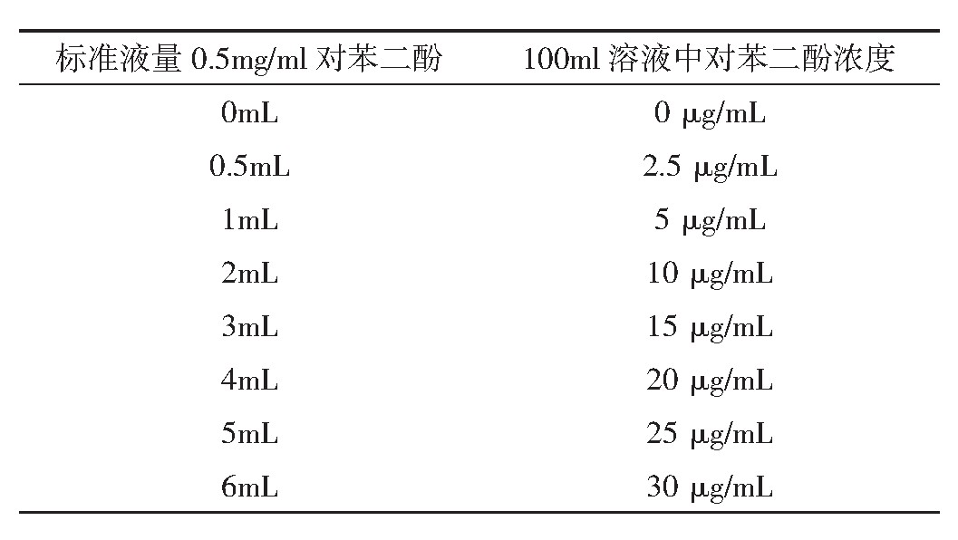 a) 母液配制:取0.25g (精确到0.0002g) 对苯二酚于500mL容量瓶中, 用甲醇稀释到刻度, 摇匀。b) 吸取上述溶液5mL到50mL容量瓶中, 用甲醇稀释到刻度 (此标准溶液中50mL含0.5mg/mL对苯二酚) 。c) 按表1配置标准溶液。