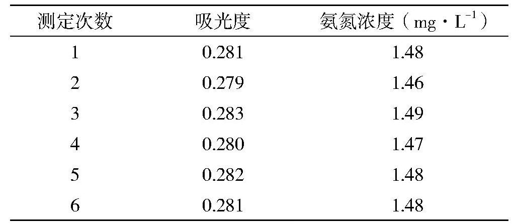 选取一个已知氨氮浓度的样品,使用岛津UV-2600紫外分光光度计,按照已建立的标准曲线测定方法和实验条件,在同一批次内对该样品进行10次重复测定,得到的吸光度数据如表2所示。