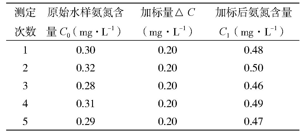 选取实际水样进行检测,在水样中加入已知量的氨氮标准溶液后进行测定,相关结果见表6。