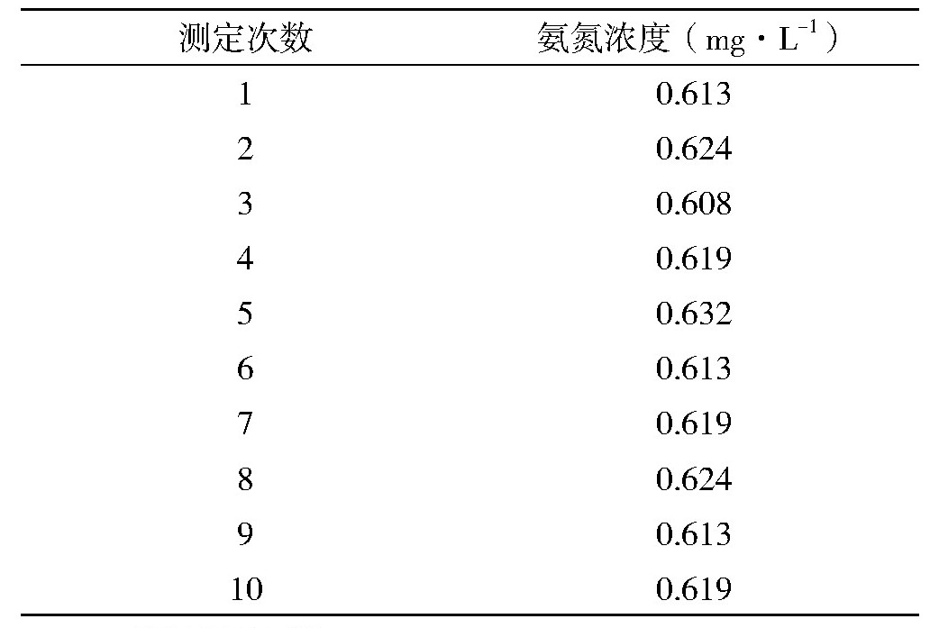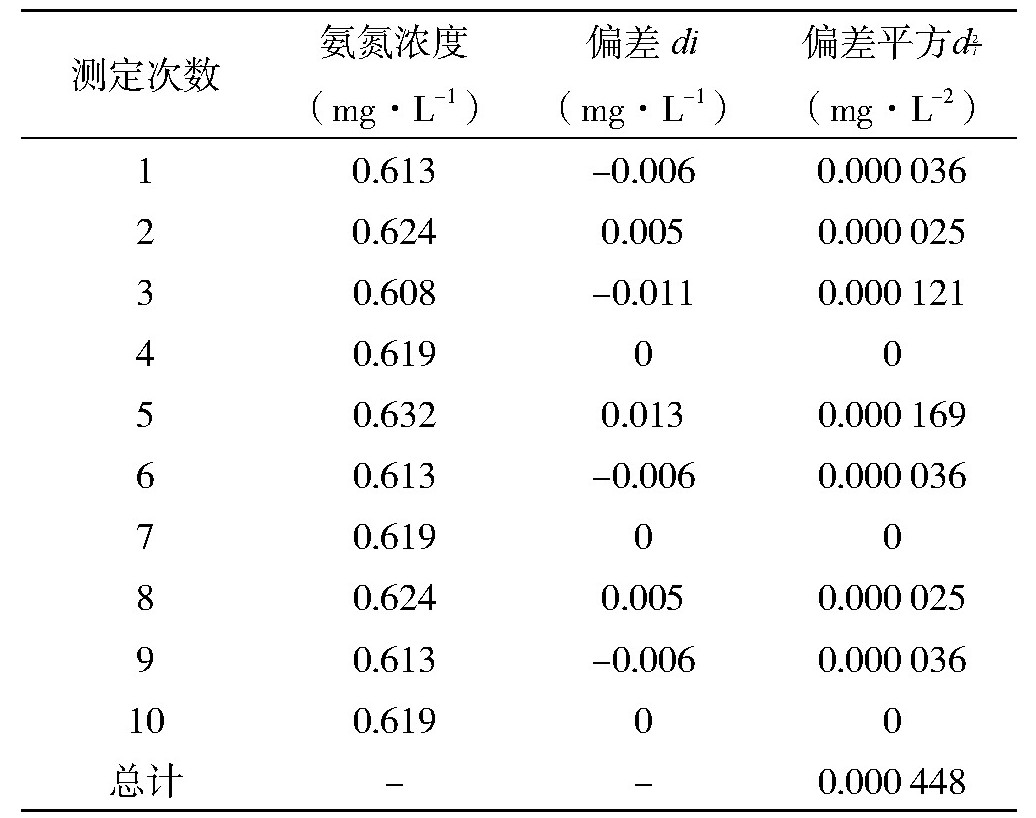 10次测定结果计算得到氨氮浓度的平均值为x=0.619 mg·L-1,相对标准偏差(RSD)为3.61%。相关计算数据如表4所示。