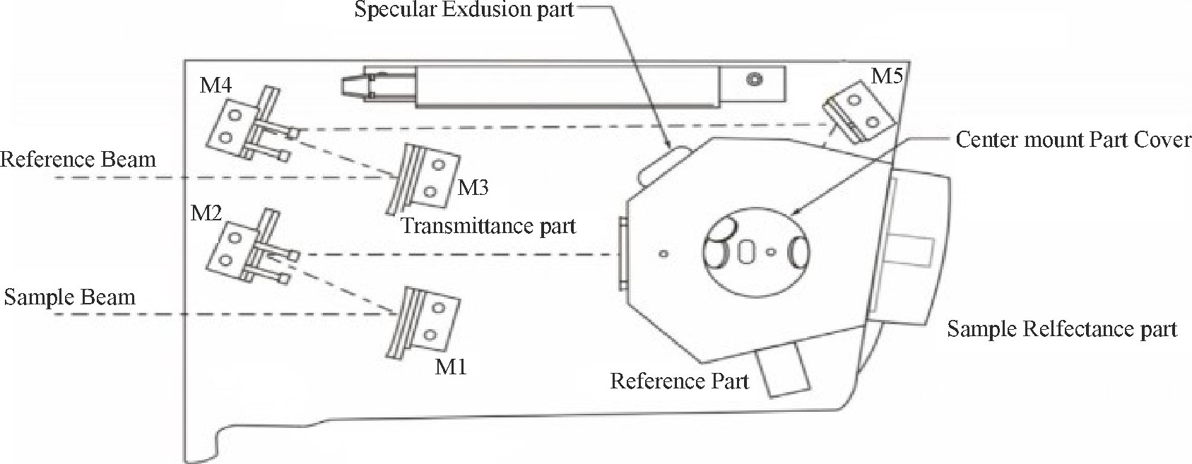 积分球 (integrating sphere) 主要作用是通过漫反射对样品信号进行匀光, 光通过样品后产生的各向异性光束在积分球腔体内进行全方位的漫反射, 被平均后的样品光信号被光电倍增管经一步放大而被检测。因此, 积分球的使用克服了传统用光电倍增管直接作为检测器的缺点, 即结果不受样品光束形状的影响, 最终使得测试结果更为可靠精确。Φ150 mm积分球是内层涂有聚四氟乙烯涂层的空心球体, 几何形状 (Transmittance/Reflectance) 为0°/8°结构, 检测器为R955光电倍增管, 可见区380 nm-780 nm绝对反射率高于99%, 开孔率小于2%, 具有最佳孔径比, 聚四氟乙烯涂层长期使用不发黄变性, 光学性能稳定, 包含光阱设置, 可直接测漫反射和剩余反射, 反射基准使用硫酸钡。使用方便, 即插即用。Φ150 mm积分球的内部光学系统如图1所示。