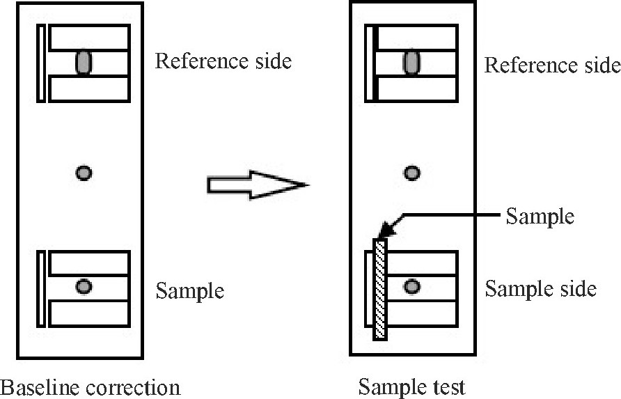 (3) 将标准白板设置在规定位置上, 并将薄膜架或液体池架设置在紧靠积分球测定光入口位置, 在空置的状态 (Air) 下, 不需要安装光阱, 进行基线校正。