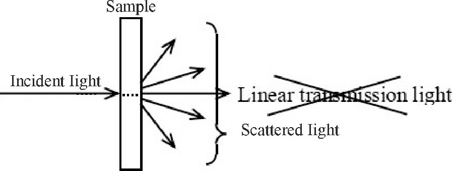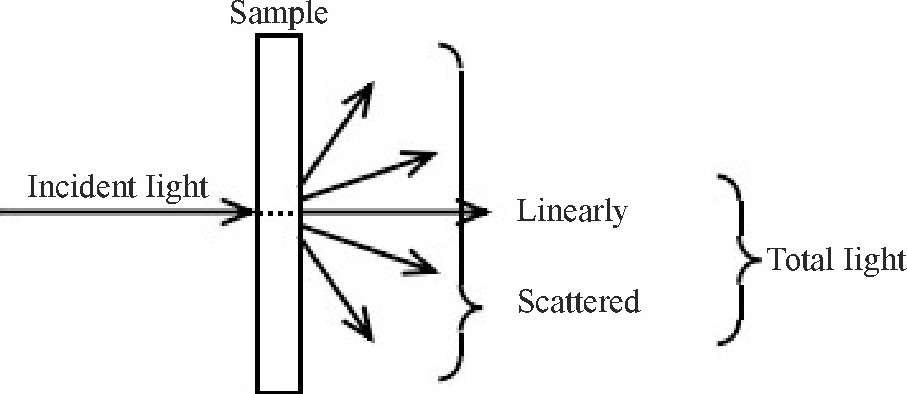 (1) 与全光线透射光、直线透射光的关系:理论上, 从全光线透射光中除去这个散射透射光, 就剩直线透射光, 但直线透射光在一定角度范围内也具有一定的扩散。受此影响, 测试的结果并不一定符合以上理论值。
