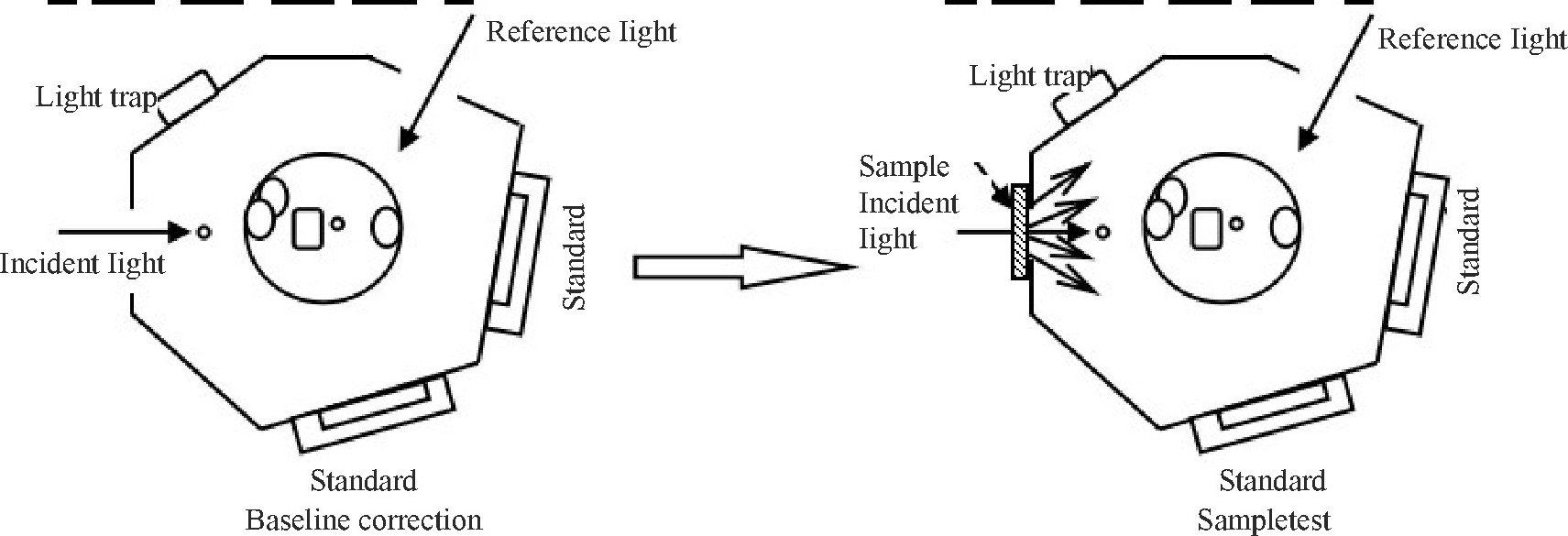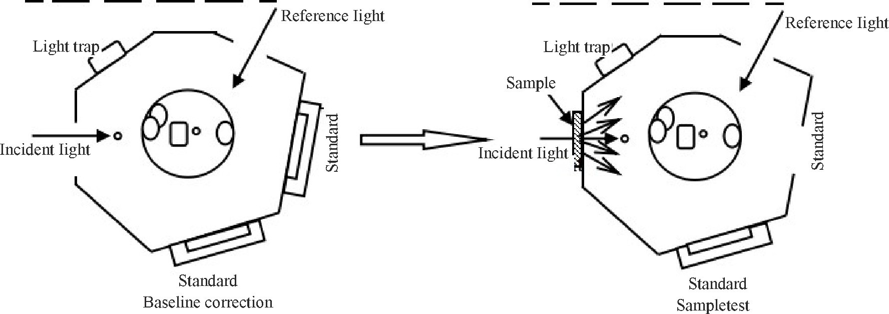 (1) 使用积分球进行不含镜面反射的漫反射测定。需使用光阱, 使得从样品反射光中镜面反射光被光阱捕获, 不被检测到。