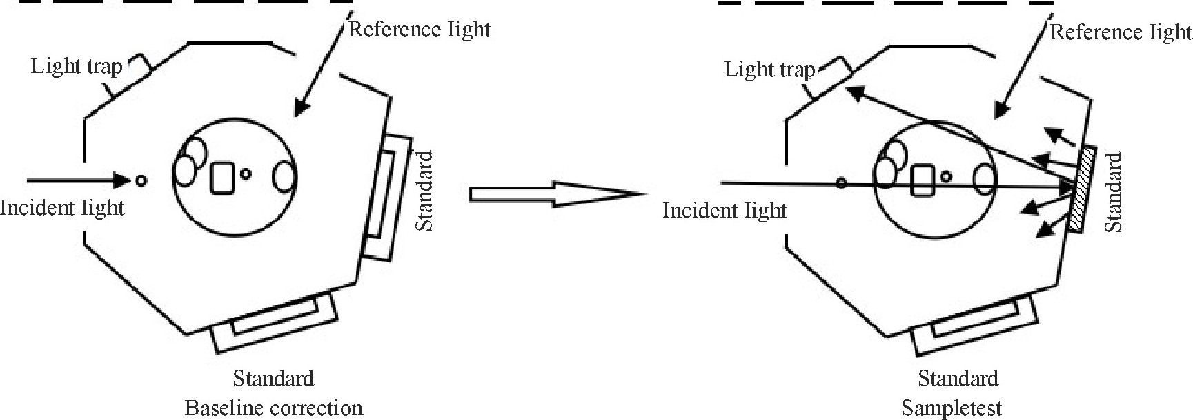 (3) 将标准白板设置在规定位置, 不设置光阱, 则镜面反射光返回积分球内, 进行基线校正。