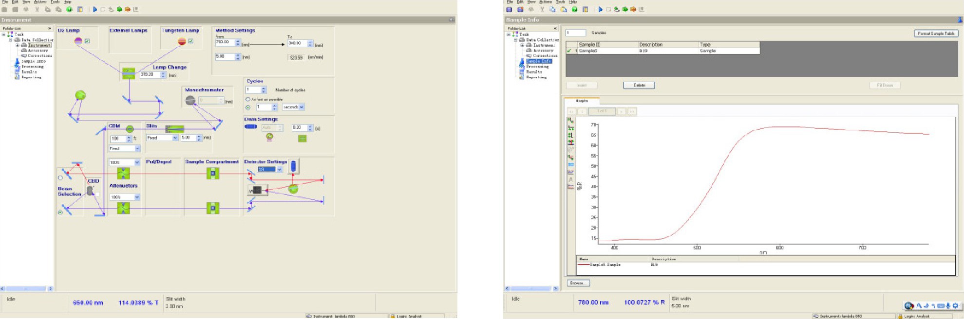 美国Perkin Elmer公司Lambda 850紫外-可见分光光度计[5], 波长范围175-900 nm, 采用预校准并可自动切换的碘钨灯与氕灯, R6872型高性能的光电倍增管, 并配有薄膜架, Φ150 mm积分球 (Integrating Sphere) 等附件, 操作软件UV Winlab5.0。另外, 购买了高级光谱软件包 (ASSP, Advanced Spectroscopy Software Package) , 此软件包具有强大的功能, 它根据有关国际标准, 处理测试结果, 操作方便, 数据准确, 包括:色度 (color) 、滤光片 (Optical filters) 、建筑玻璃 (Architectural glass) 、防护玻璃 (Protection glass) 、数学运算 (Arithmatic functions) 及数据库 (Spectrum database) 等模块, 针对不同行业, 运用各模块可快速、准确的获得测试结果。