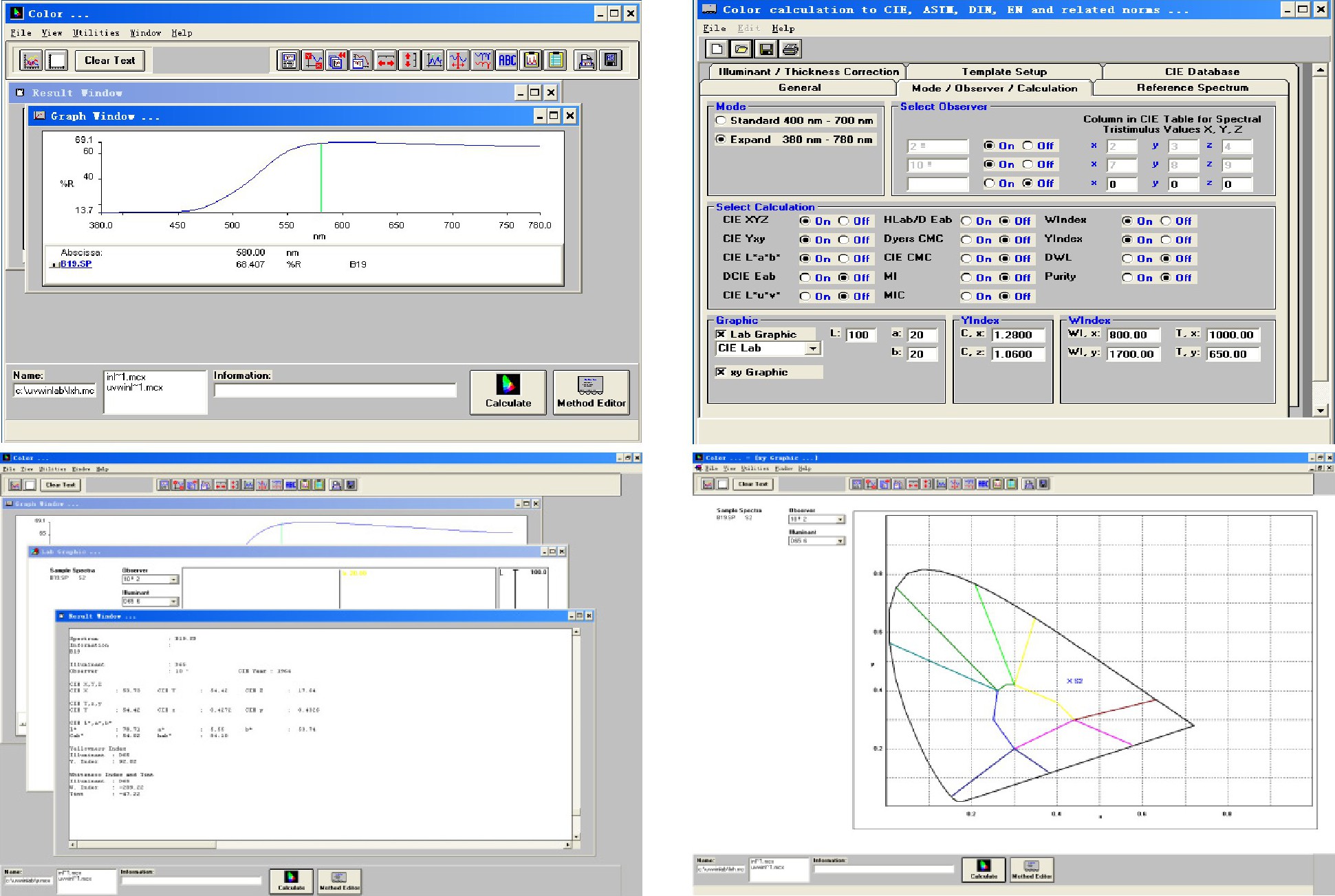 第三步:打开color运算软件, 如图14, 首先导入B19#.sp谱图;然后, 编辑计算色度的方法, 依据CIE1964或CIE1976需要输入光源、观察角度等, 共有6个模块需要设定, 保存计算方法。注意:CIE Database模块一般不作任何修改。最后, 调入该计算方法, 进行CIE色度计算, 计算的结果如CIE XYZ, L*a*b*值、Graphic, 白度值及黄度值等数值与图表可直接导出。