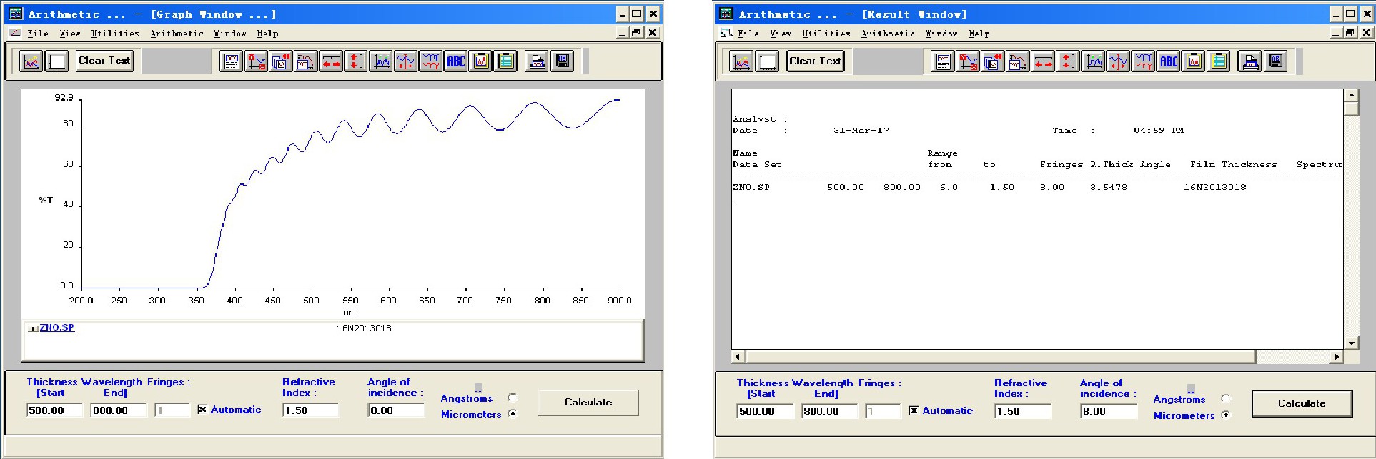 第三步:打开数学运算 (Arithmetic Module) 模块, 选择薄膜厚度 (Film Thickness) 功能, 如图15, 首先, 导入Zn O.sp光谱数据, 可一次导入多个光谱数据进行比较;然后, 输入起始计算波长500 nm、终止波长800 nm, 折射率1.5, 样品的入射角度8°, 软件可自动计算波长范围间峰数, 也可以手动输入峰数, 输入完毕, 点Calculate计算, 结果可直接导出。